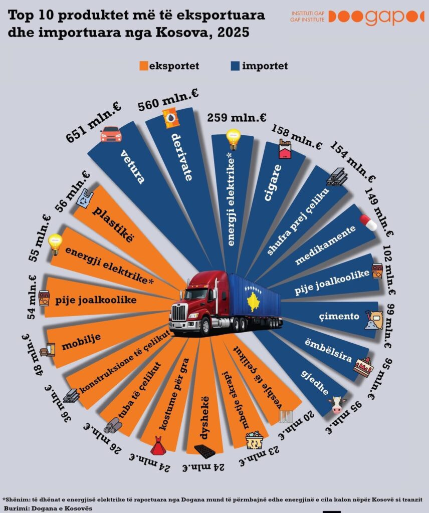 Instituti GAP ka publikuar një grafik informues mbi 10 produktet më të eksportuara dhe importuara nga Kosova gjatë vitit 2025, bazuar në të dhënat e Doganës së Kosovës. Sipas këtyre të dhënave, importet dominohen nga veturat me vlerë 651 milionë euro, të pasuara nga derivatet e naftës me 560 milionë euro dhe energjia elektrike me 259 milionë euro. Në listën e importeve kryesore përfshihen gjithashtu cigaret (158 mln €), shufrat prej çeliku (154 mln €), medikamentet (149 mln €), pijet joalkoolike (102 mln €), çimentoja (66 mln €), ëmbëlsirat (96 mln €) dhe gjedhët (95 mln €).