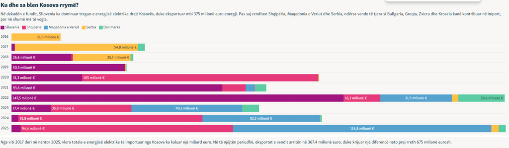 Kosova vazhdon të mbetet e varur nga importi i energjisë elektrike, një varësi që po i kushton shtrenjtë buxhetit të shtetit dhe ekonomisë në përgjithësi. Të dhënat zyrtare tregojnë se nga viti 2017 deri në nëntor 2025, vlera totale e energjisë elektrike të importuar nga Kosova ka kaluar shifrën e 1 miliard eurove, ndërsa eksportet në të njëjtën periudhë kanë arritur vetëm 367.4 milionë euro, duke krijuar një hendek negativ prej rreth 675 milionë eurosh.