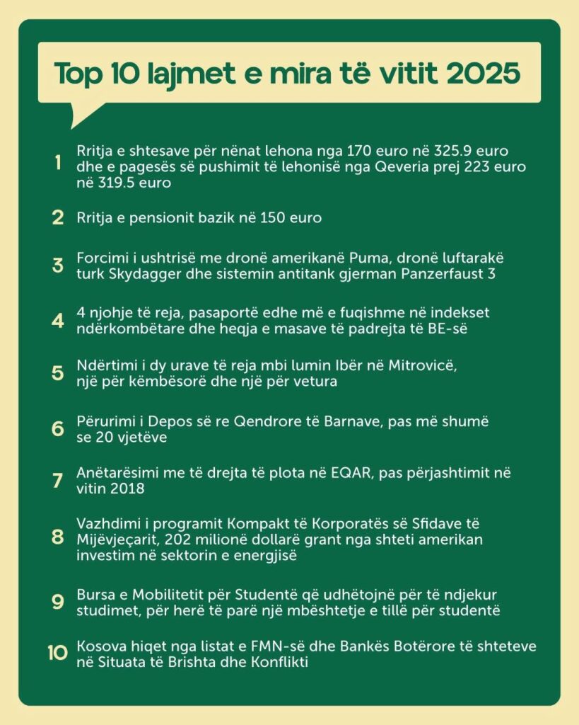 Kryeministri i Kosovës, Albin Kurti, ka vlerësuar vitin 2025 si një vit me zhvillime të rëndësishme pozitive për vendin dhe qytetarët, pavarësisht sfidave të shumta. Përmes një postimi në rrjetin social Facebook, Kurti ka renditur dhjetë lajmet që i cilëson si më të mirat e këtij viti.