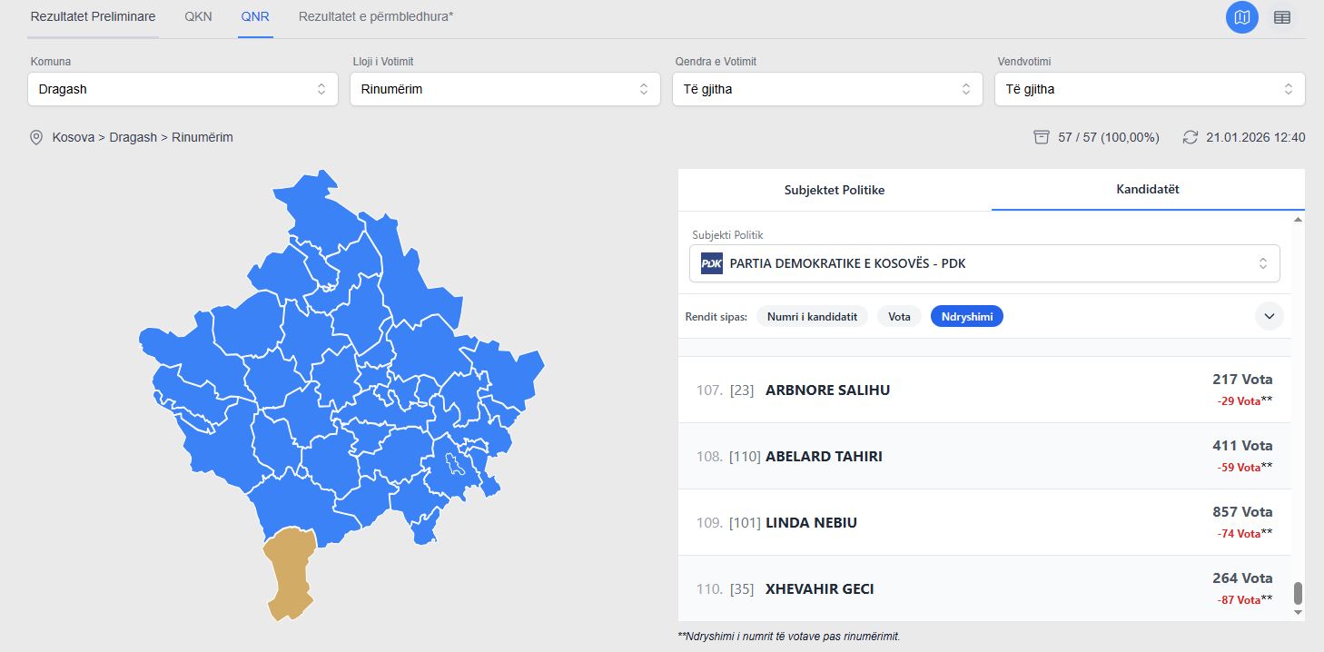 Te Partia Demokratike e Kosovës, gjatë verifikimit te kjo komunë, del se kandidatit të cilit i janë hequr më së shumti vota është Xhevahir Geci – që pas rinumërimit ka 87 vota më pak.
