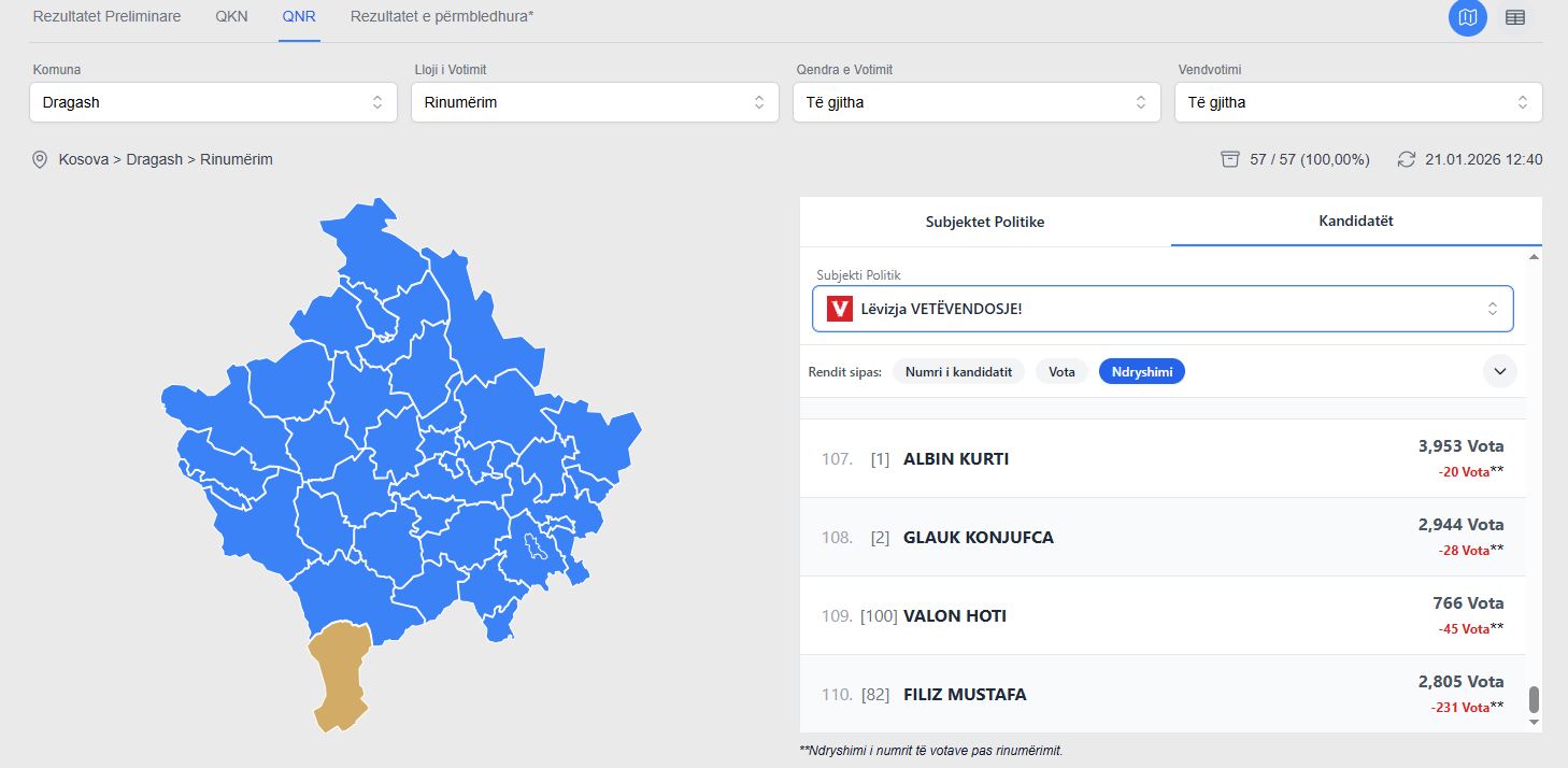 Bazuar në përditësimet e KQZ-së, del se një kandidat i Vetëvendosjes mbi 200 vota më pak.