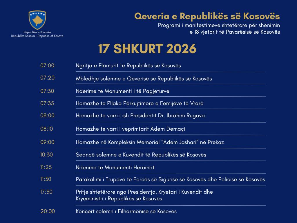 Qeveria e Republikës së Kosovës ka publikuar programin zyrtar të manifestimeve shtetërore për shënimin e 18-vjetorit të Pavarësisë së Kosovës, që do të mbahet më 17 shkurt.